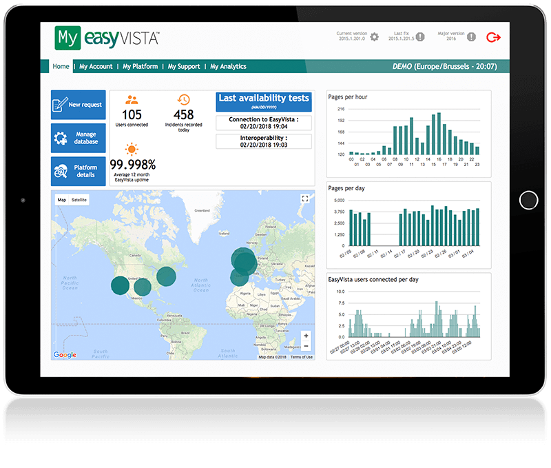 With SSAE-18 audited processes, big data analytics, and global datacenters, EasyVista's platform is delivered as a SaaS subscription (also available on-premises). Security, availability, and performance are assured while providing complete transparency via the MyEasyVista.com portal.