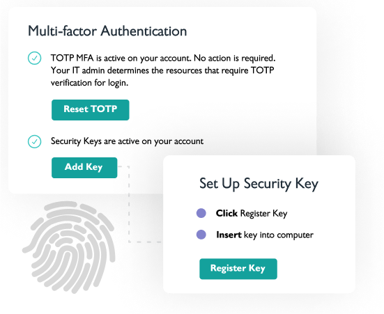 Securely provision employee access to servers with 2FA settings for storage infrastructure, user-generated and admin-governed SSH keys to achieve compliance, and insights into device status.