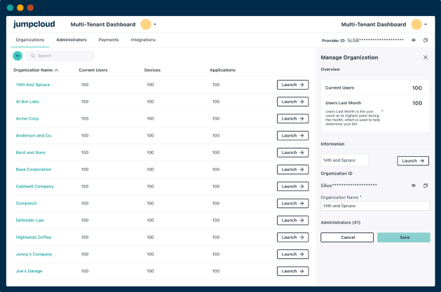 If you’re looking to enhance security and efficiency for your entire client base, JumpCloud is the solution you need. From managing users’ access to ensuring their security, JumpCloud’s Multi-Tenant Portal empowers you to provide frictionless access management.