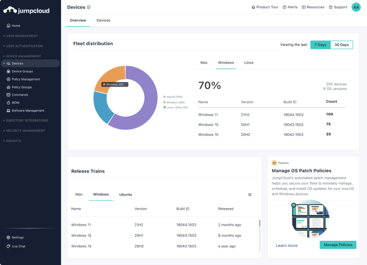 JumpCloud’s Multi-Tenant Portal gives you a comprehensive view into your clients’ user resources and behaviors. Unify identity, access, and device management with a cloud-based platform — no patching or hardware upgrades necessary, ever.