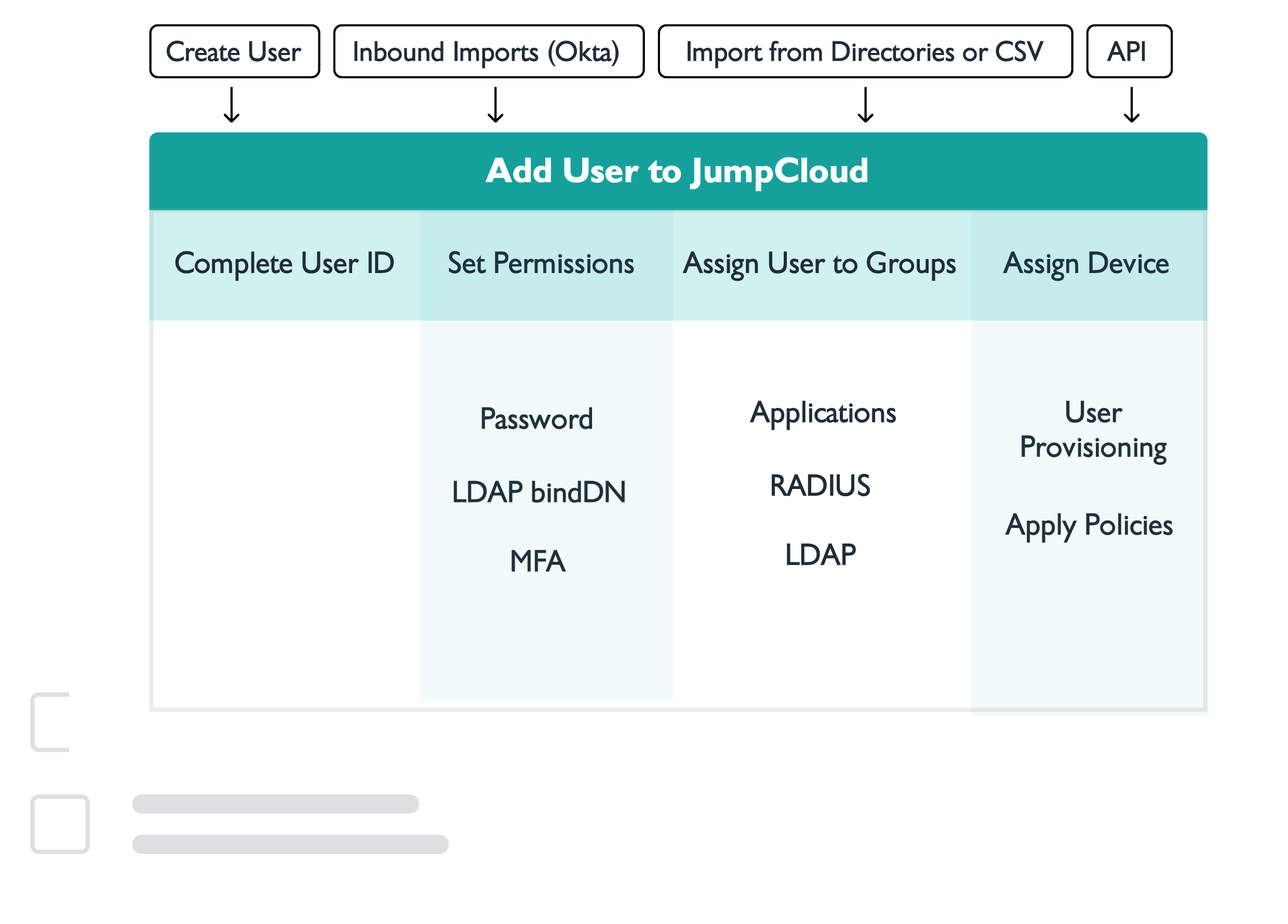 Users in JumpCloud can be quickly and efficiently deployed to devices, applications, file servers, networks, and cloud-based infrastructure.